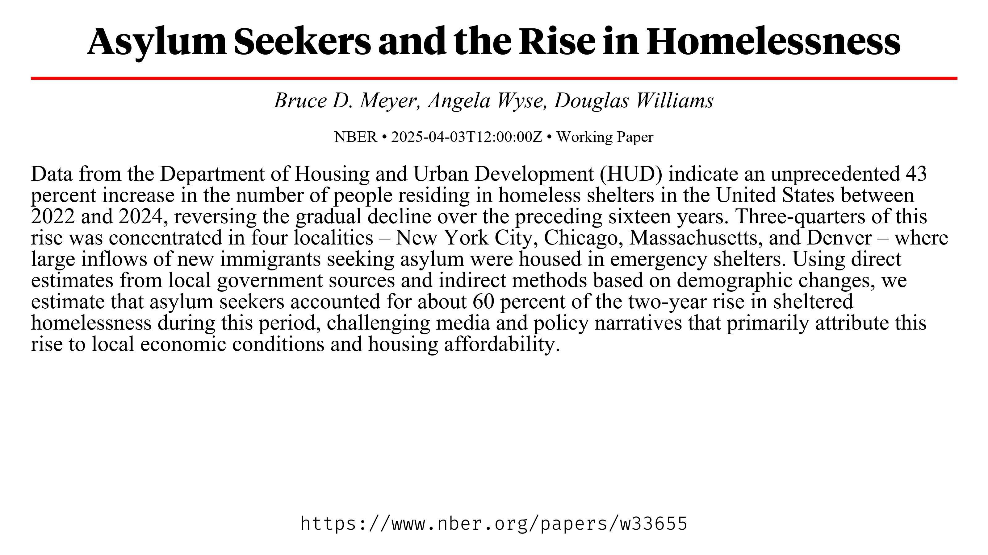 National Bureau of Economic Research: Asylum Seekers and the Rise in Homelessness