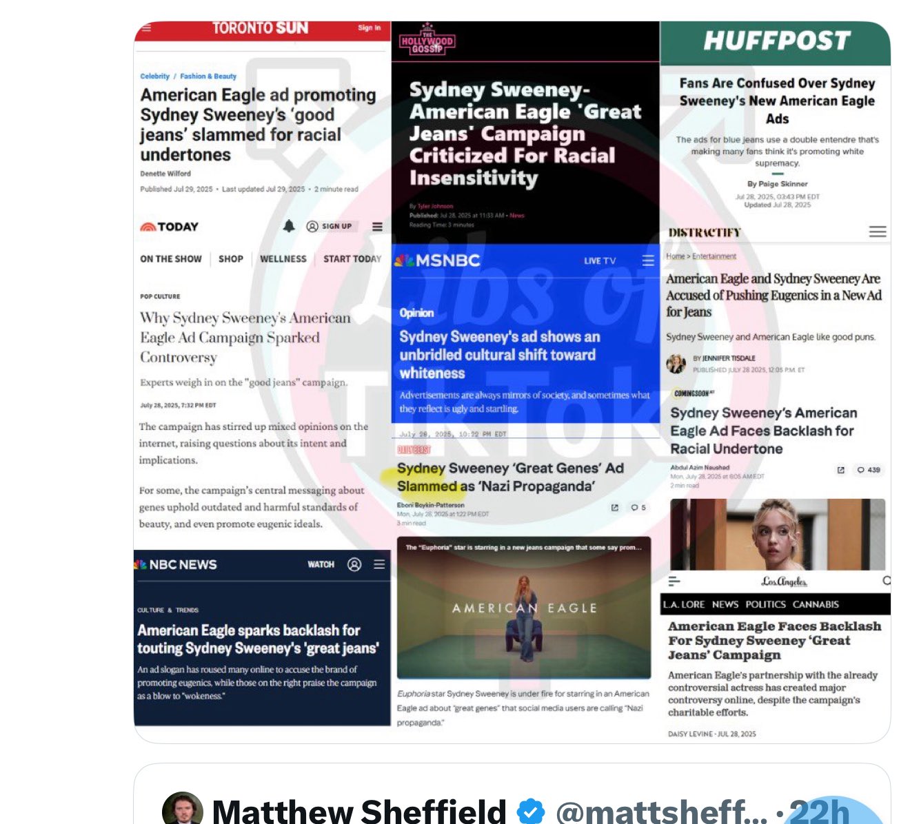 Matthew Sheffield @mattsheffield: “🧵Right-wing extremists like Libs of Tiktok and Charlie Kirk totally concocted the Sydney Sweeney "outrage." The supposed left-wing outrage at Sweeney never happened. Republicans made it up. Republicans have been inventing people to rage against for decades…” https://pbs.twimg.com/media/GxyWCGcboAA98jE?format=png&name=900x900 —— Ron Filipkowski @RonFilipkowski: “Fox and monetized right-wing clickbait accounts did two weeks of content on a made up hoax about phantom libs outraged about Sweeney’s jeans ad. They’ll be back next week with another one to feed into the Fake Outrage Machine for the cult. What a sad, pathetic existence.” —— Yes, nothing says 'Right-wing clickbait' accounts like the Toronto Sun, HuffPost, the Today Show, MSNBC, NBC News, and Good Morning, America. https://pbs.twimg.com/media/Gx3GC06W8AAOThz?format=jpg&name=large