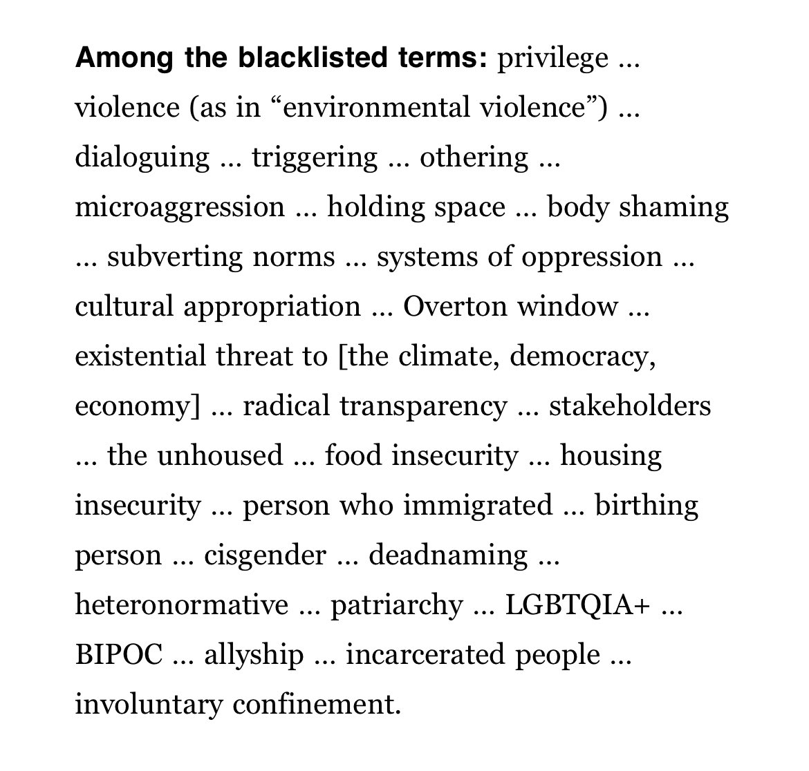 A pivot to the South? If true, it doesn't seem like a great time for the Democrat Party to be shifting harder to the left, even as their base demands exactly that. Outside groups who want to help Democrats win more elections are practically begging them to get more mainstream, moderate and normal: Third Way is circulating a memo, shared first with Politico Playbook, featuring a new black list of words Dems shouldn’t use. https://pbs.twimg.com/media/Gy9EY1HXkAAMGbc?format=jpg&name=medium —— What words would even remain in their lexicon, if you deprived them of their cringey leftist vernacular? Voters want normalcy, yet Democrats are out here nominating Communists in high profile races and doing things like this because their culture is so deeply infused with identity-fixated wokeness and weirdness. They can't help themselves. (…)