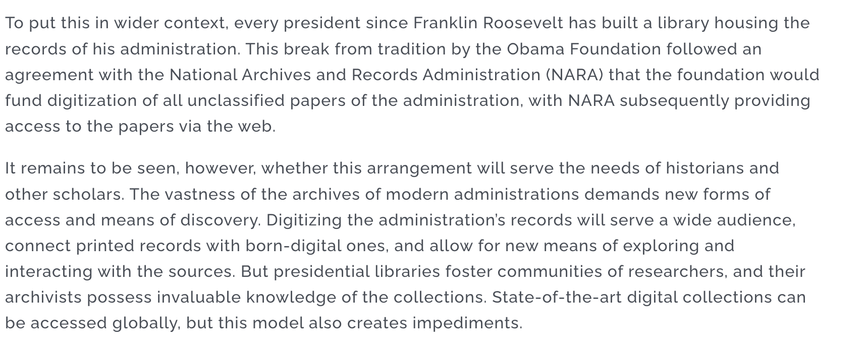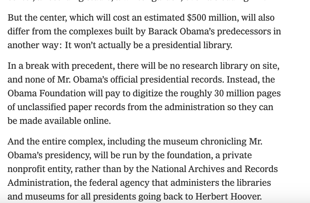 Posted • December 13, 2025: Something many Americans may not realize is the Obama Presidential Library will not actually be a library in the truest sense. It will be a 'center' and run privately. Barack Obama made that very conscious choice so his people could control how much access the public and journalists have to his archives and records. Kind of strange, huh? —— As the NYT reported, the Obama Presidential Center is a "center" not a library, Obama privatized the archive and does not allow the National Archives and Records Admin to run it. Here it is in black and white. https://pbs.twimg.com/media/G72Qn3QXgAAtQkM?format=png&name=medium —— Here's the American Historical Association on the Obama Center decision not to have a library. https://pbs.twimg.com/media/G76wBh0XgAAVh2B?format=png&name=large —— I’m curios what the logic for this is. I can’t assess any since my general impression is these things are all ego/legacy plays. Presumably it is to limit researcher and media access to only certain documents. What is Obama hiding? (…)